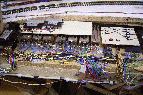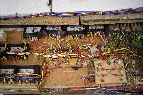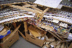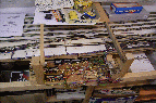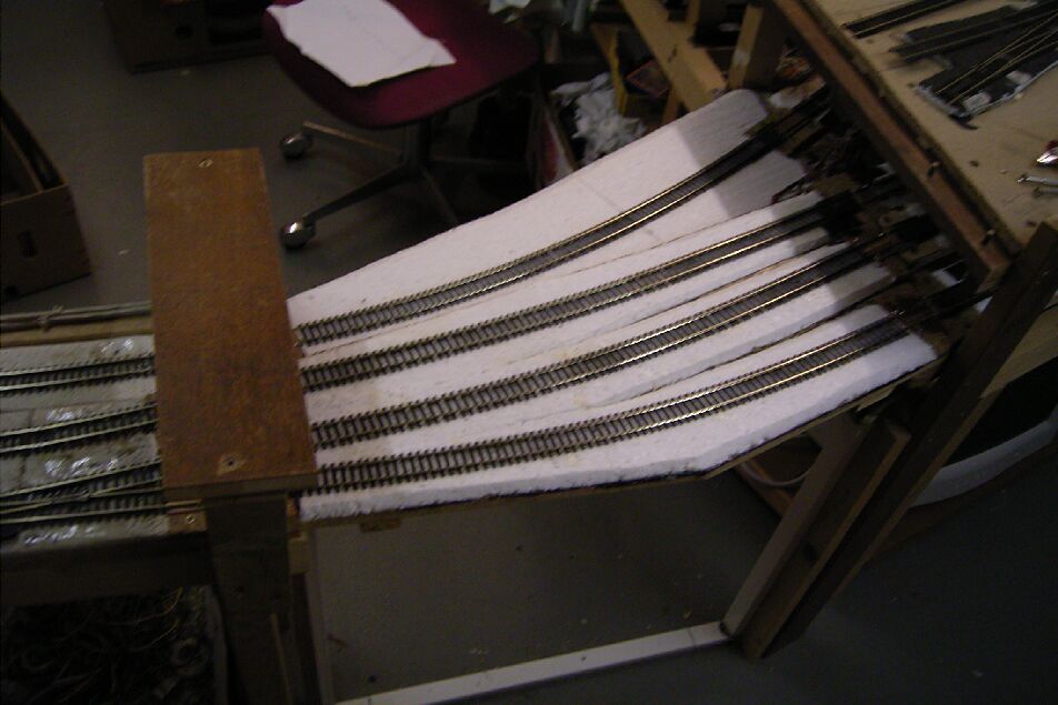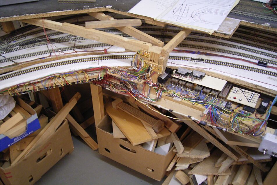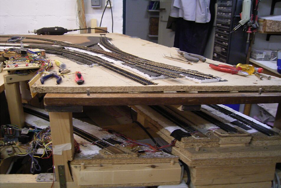 Die Anlage ist aufgeständert, unter der Anlage befindet sich der Stauraum für das Bastelmaterial. Die Gleise liegen punktuell verklebt auf 10 mmm Styropor, dieses ist flächig auf 16 mm Spanplatte verklebt. Um in den Innenteil zu gelangen, muß ich drei Brückenteile aus- und wieder einsetzen (eines obere Ebene, zwei untere Ebene) oder einfach darunter durch kriechen, es ist hoch genug.