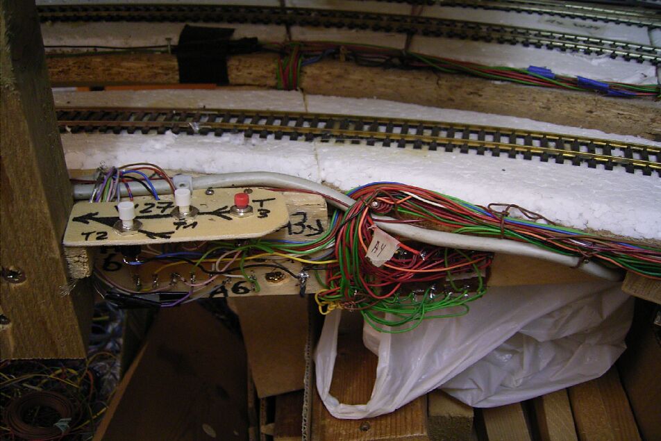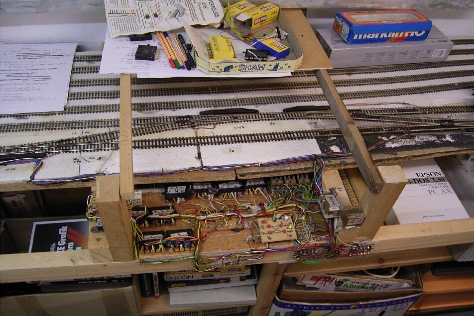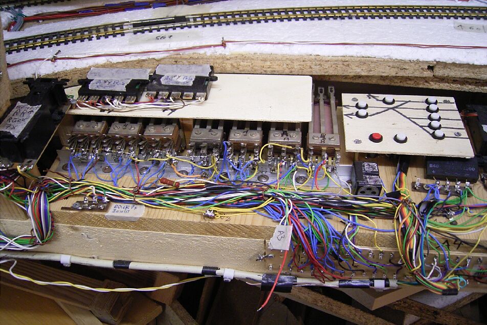 Im linken Bild links die Relaisgruppe, noch nicht ganz fertig. Im rechten Bild sieht man rechts die zwei ankommenden Gleise. Einmal aus der Wendeschleife und einmal vom oberen sichtbaren Teil. Die Züge schalten sich wechselseitig auf Vorrang. Das jeweils erste verfügbare freie Gleis wird zum Abstellen benutzt.