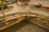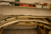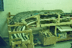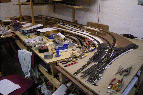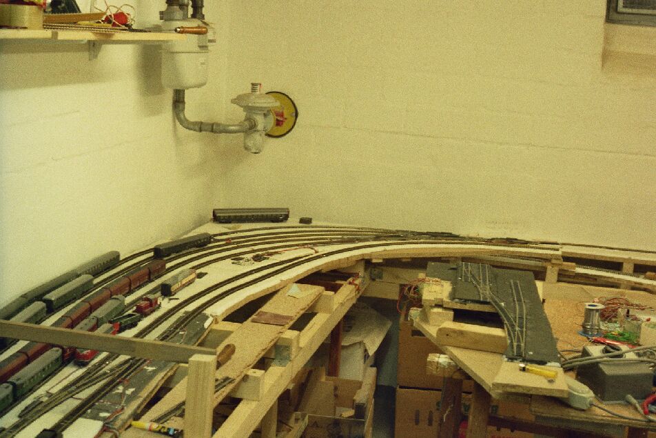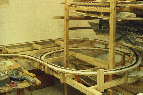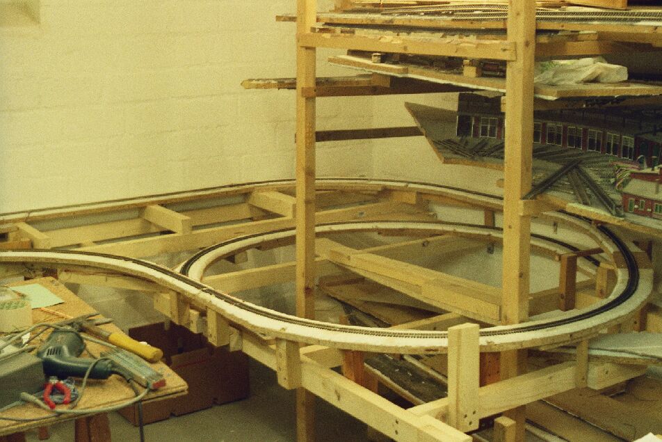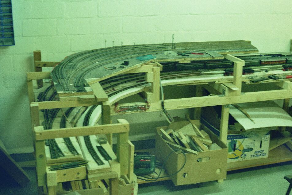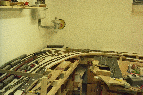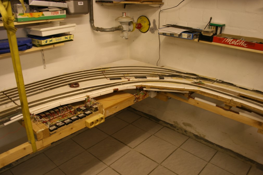 Ganz Links: Blick auf die beiden Kehrschleifen, bezogen auf die Skizze: Oben die rechte, unten die linke Kehrschleife. Das Gestell in der Mitte dient nur zur Lagerung von zur Zeit nicht benötigten Teilen der alten Anlage, die später wieder verwandt werden sollen. Insbesondere ist es die Zwischenlagerung für den Lokschuppen und für die BW-Gleisanlagen.