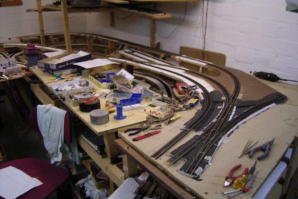 Das Grundprinzip: Hundeknochen im verdeckten Bereich mit fünfgleisigem Abstellbahnhof, daran angebunden zwei in zwei Ebenen übereinandergelegte parallel verlegte eingleisige Strecken (eine mit fünf sichtbaren Abstellgleisen) und einer davon abzweigenden eingleisigen Strecke zum BW in die dritte Ebene. Ein großer Teil der vorhandenen Segmente der 3. Anlage wurden schon bzw. werden noch eingebaut.