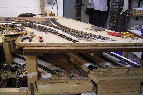 Ganz Links: Der linke Brückenkopf mit beiden Ebenen. Die Brückenteile werden durch die Holzdübel fixiert, die Gleise stoßen stumpf aneinander. Die Gleise wurden in einem Stück über die Trennstelle verlegt. Vorher wurden an den Stoßkanten Kupferplatinen aufgeklebt und in diesem Bereich das Schwellenband entfernt. Nach Testfahrten wurden die Schienen aufgelötet und dann durchtrennt.