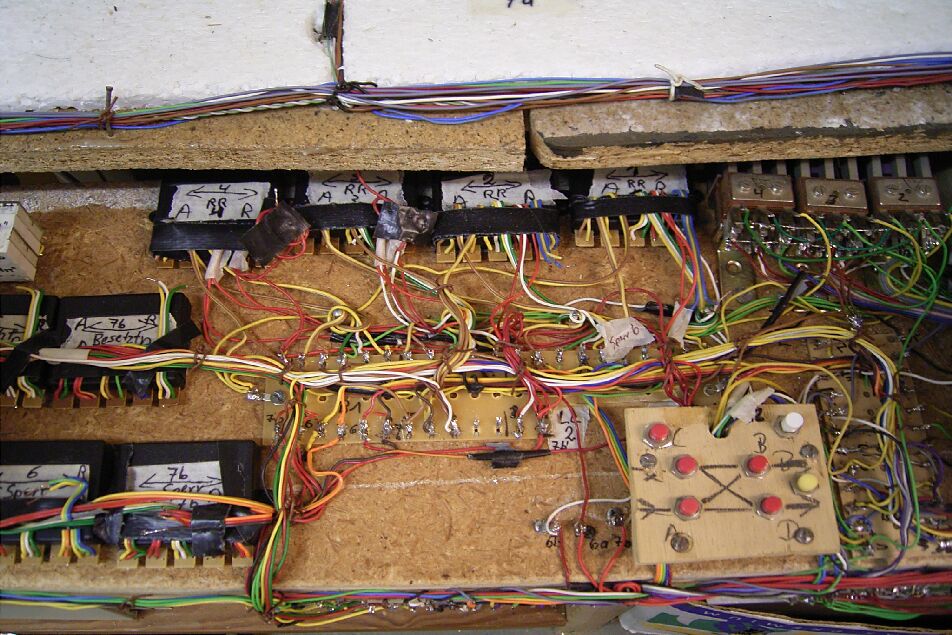 Mitte: Schalteinheit rechts, die Schalteinheit für die Ausfahrt aus dem unteren Bahnhof. Im Hintergrund auf dem Hilfsstellpult eingezeichnet die zum Arbeitstisch abzweigende Strecke. Übrigens: Ohne Dokumentation steigt man bei der Verdrahtung nicht mehr durch ...