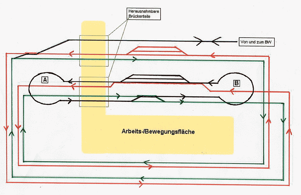 Die Skizze zeigt den Aufbau der Anlage. Das BW ist noch nicht eingebaut, auch der obere Schattenbahnhof ist noch nicht in Betrieb. Die Verschaltung der einzelnen Komponenten (z. B. Ausfahrgruppe unten oder Anbindung BW-Gleis) erfolgt 'vor Ort', zum späteren Stellpult gehen dann nur noch wenige Leitungen. Die untere Ebene ist bereits funktionsfähig, ebenso ist vom rechten Kopf die Fahrt nach oben zum BW-Gleis und mit Kopfmachen wieder zurück möglich.