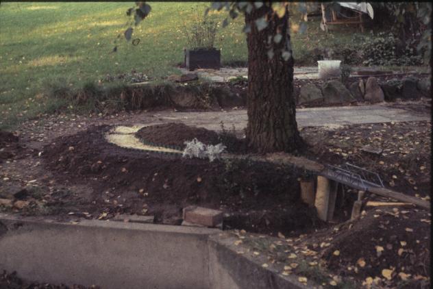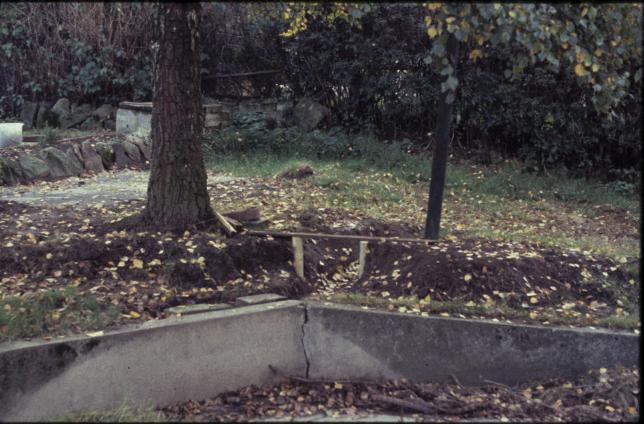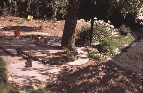 Blick auf die Bahnhofsfläche und die Brücke an der Birke. Im Vordergrund die Betonmauer. Die Fläche links vom Bahnhof wurde noch nicht aufgefüllt. Etwas anderer Blickwinkel. Man sieht: Die Fotos liegen zeitlich vor den großen Erdbewegungen. Blick von oben auf Bahnhof und Birke. |