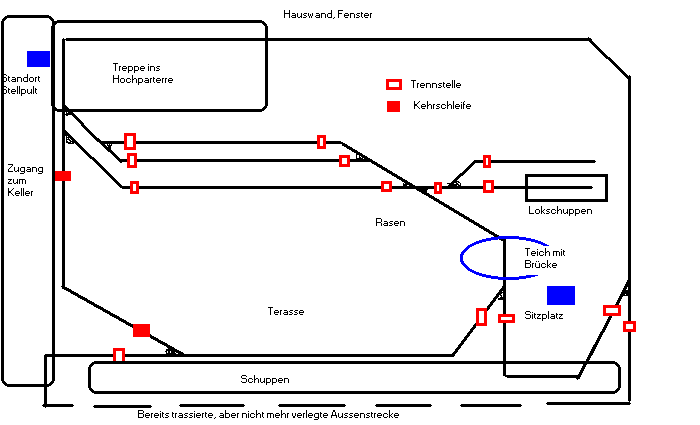 unmaßstäbliche Skizze sowie Fotos meiner 2. Anlage unten. Die Gleise lagen teilweise auf Terassenplatten,