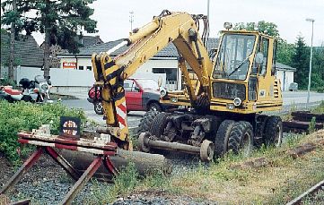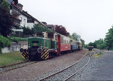 Diesellok O&K, Aufnahme am 4.6.01 im Bahnhof Oberzissen. Die Lok war als Schublok hinter dem dampfbespannten Zug von Brohl nach Oberzissen gelaufen. In Oberzissen wurde der Zug geteilt. Der