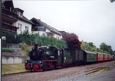 Dampflok V in Oberzissen am 4.6.01, links gerade aus Niederzissen angekommen (hinten ist undeutlich die ‘Schublok’ zu erkennen, rechts beim Abkoppeln und Umsetzen. |