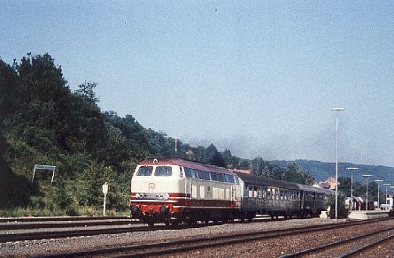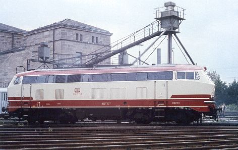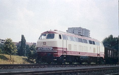 Die Diesellokomotive 218 217-8 war die einzige Diesellok der DB in InterCity-Farbe. Am 23.7.85, ca. 14.00 Uhr im Bw Nürnberg 1.