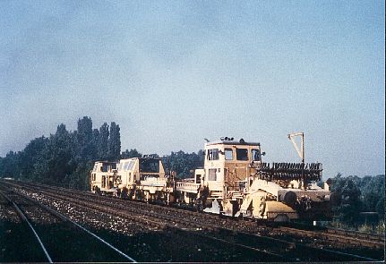 Bauzug , am 25.7.85, ca 9.00 Uhr auf der Fahrt von Nürnberg Rhf nach Nürnberg-Ost.Links als Kopf dürfte eine Nivellier- und Stopfmaschine fahren, möglicherweise Plasser. Beim hinteren Teil könnte es sich um eine Reinigungsmaschine handeln.