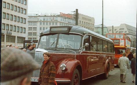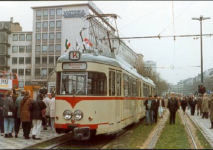 1269 (‘Linie K nach Krefeld’) Zeitgleich mit dem Korso der Rheinbahn fand ein Oldtimertreffen statt. Im Vordergrund ein Mercedes-Benz Reisebus