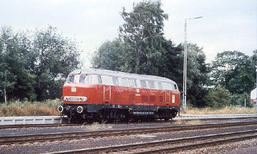 V 160 003 am 27.7.85 beim Rangieren in Schnabelwaid, ca. 15.30 Uhr.