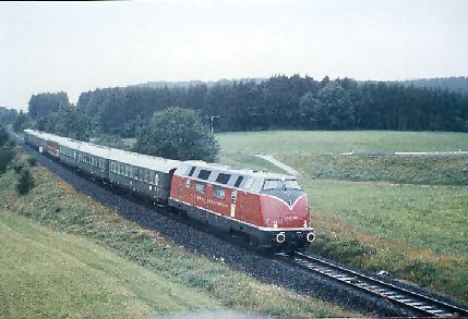 V 200002 am 21.7.85 mit einem Sonderzug auf der Fahrt von Nürnberg nach Weiden. Aufnahmestandpunkt aus dem Fenster meines VW-Busses von einer Brücke bei Neukirchen. Alles glänzt vom Regen.