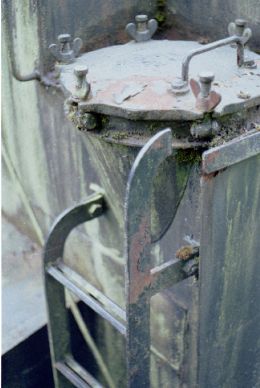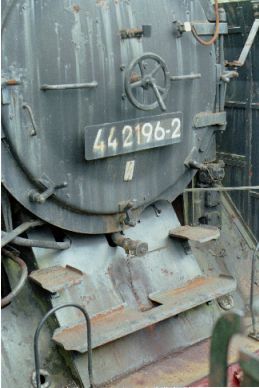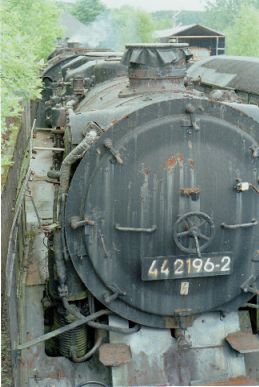 (44 196, 44 0196-4 mit Ölhauptfeuerung, Krupp 1939, Fabriknr. 2018, ohne Mittel-Zylinder) im Freigelände neben dem alten Kohlenbansen, ganz rechts Tenderaufstiegsleiter und Wasserluke.