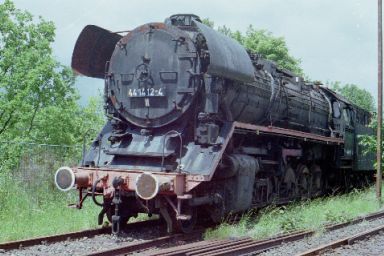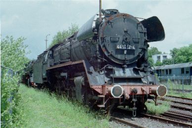 (44 1412, 44 0412-5 mit Ölhauptfeuerung, Schichau 1943, Fabriknr. 3604, ohne Mittel-Zylinder) im Freigelände Neubauersatzkessel, kein Speisedom.
