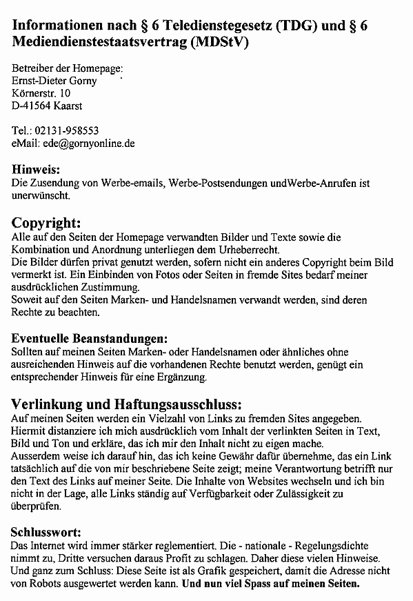 Unter Hinweis auf die Entscheidung des Bundesgerichtshofs vom 1. April 2004 (Az. I ZR 317/01) erkläre ich hiermit ausdrücklich, das bei Setzen des jeweiligen Links mir keine Umstände bekannt waren, aus denen sich Anhaltspunkte für rechtswidrige Inhalte jeglicher Art ergaben. Sollten derartige Umstände nach Setzen des jeweiligen Links eingetreten sein würde ich den Hyperlink nach Hinweis entfernen.